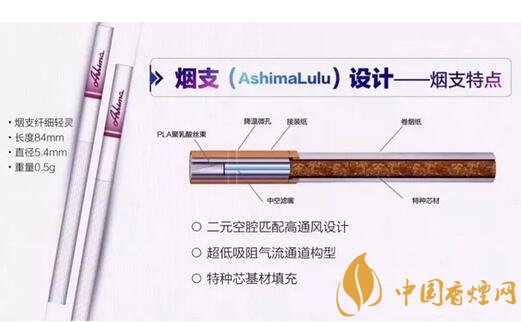 煙支Ashima Lulu,為纖細型,長84mm,直徑5.4mm,重量只有0.5克。具有二元空腔匹配高透風設計、超低阻氣流通道構型、特種芯基材填充等特點。