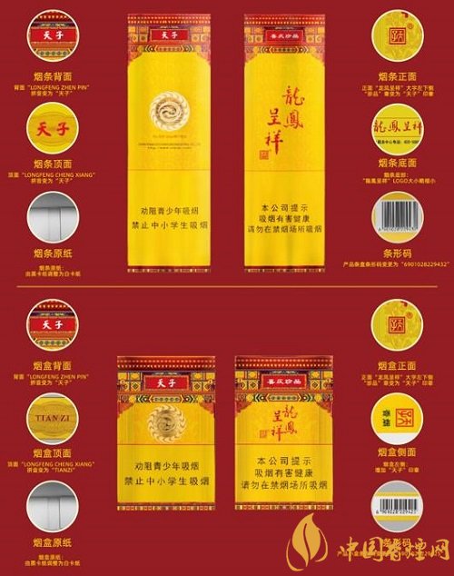 改名為天子(硬珍品龍鳳呈祥)之后,這款香煙的參數依然為:焦油量:11mg;煙堿量:1.1mg;一氧化碳量:12mg;煙長為84mm。香煙售價為21元/包,批發價格:180.2元/條。