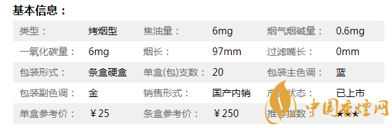 包裝色調:藍(金) 小盒條碼:6901028115377 條包條碼:6901028115384 單包支數:20
