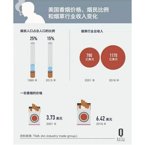 根據市場調研公司的報告,2001 年至 2016 年期間,美國香煙的銷售數量減少了 37%,與此同時,美國吸煙人口的比例也下降了,但煙草公司的利潤卻上升了。在2016 年,美國煙草行業的利潤達到了 184 億美元。(跟我國一比這好像都不算什么了)