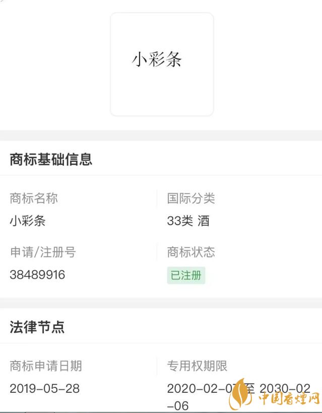 據了解,汽化酒這個項目,狼煙天下在2019年5月就開始立項了。還特意在33酒類申請了商標,商標名字也叫做“小彩條”。