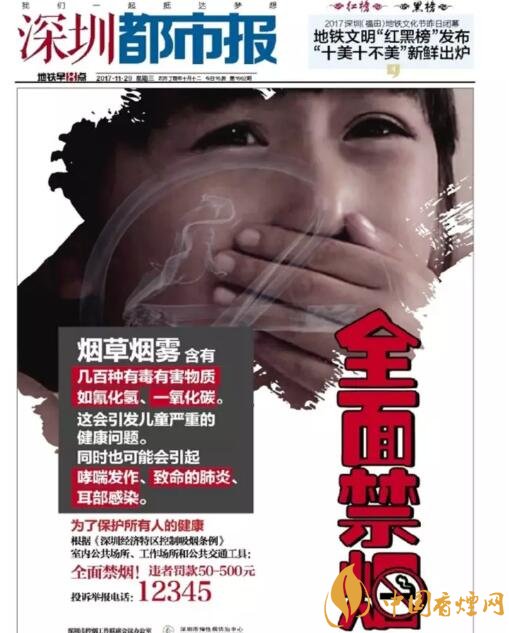2017 年 11 月 29 日,深圳都市報上對于目前深圳的禁煙狀況作了調查報導。調查中顯示,目前禁煙狀況最不理想的 3 類場所是酒吧/歌舞廳(69.6%)、網吧/游藝廳( 60.1% )和休閑服務場所(43.2%)。《深圳經濟特區控制吸煙條例》已經實施了 3 年多,對所有室內公共場所、工作場所、公共交通工具以及部分室外區域全面禁煙,目前已經收到了良好的反饋。