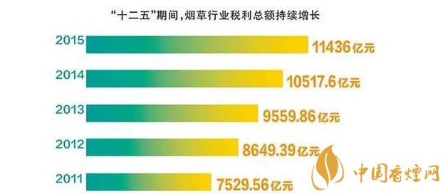 就“十二五”期間,煙草行業稅利占國家財政收入的比重保持平穩,始終保持在7.2%~7.5%的較高水平。五年上繳財政總額4.13萬億元,年均增長17.5%,比同期全國財政收入年均增長率高4.7個百分點。2015年,在經濟下行壓力持續加大的情況下,煙草行業為國家財政增收做出了更大貢獻,充分體現了國家財政收入“蓄水池”的功能。