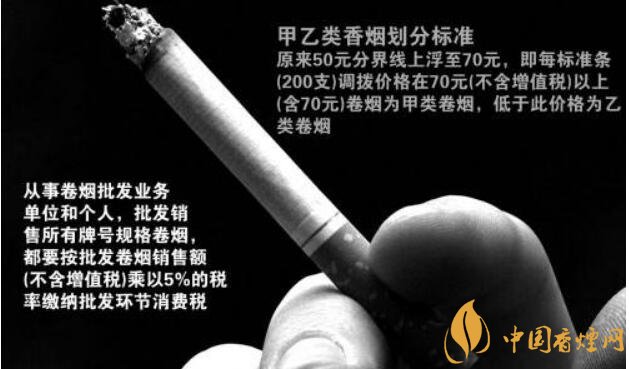 甲類卷煙(調撥價70元或以上/條):稅率56%,另收0.003元/支,于生產環節征收;乙類卷煙(調撥價低于70元/條):稅率36%,另收0.003元/支,于生產環節征收;