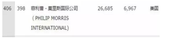 翻遍整個榜單,終于在末尾出發現了榜單唯一一家煙草公司--菲利普•莫里斯國際公司(簡稱菲莫國際,萬寶路就是它家生產的),以營收266.85億美元、利潤69.67億美元排名世界500強第406位。