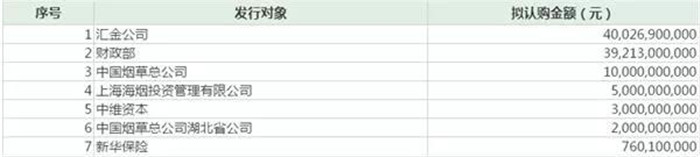 除去匯金公司和財政部,其余的發行對象中,中國煙草總公司、上海海煙投資管理有限公司、中維資本、中國煙草總公司湖北省公司四家均為“煙草系”法人。