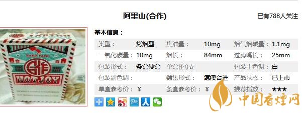 阿里山香煙是來自寶島臺灣的一個(gè)香煙品牌,是阿里山集團(tuán)有限公司推出的高端卷煙品牌,這個(gè)品牌熱銷海外,深受全球華人的喜愛,那么阿里山合作香煙v1多少錢,現(xiàn)在就由香煙網(wǎng)小編為大家介紹臺灣合作v1香煙的價(jià)格圖片。