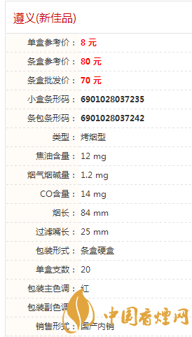 遵義(新佳品)香煙為遵義品牌旗下的一款香煙。佳品“遵義”是遵義集團新開發的遵義系列產品之一。該產品選用國內外不同類型,不同地區,不同年限的優質煙葉原料,借助先進的理化分析手段和致香物質研究成果,經過多次精心試制開發而成。 該產品香氣清雅飄逸,豐滿諧調,余味純凈。給人以優美舒適的感覺。