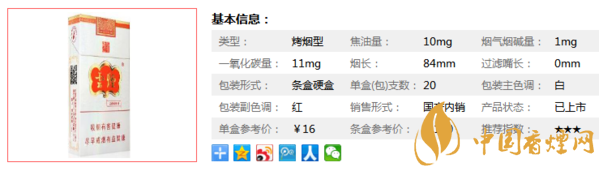 類型 :烤煙型 焦油量 :10mg 煙氣煙堿量 :1mg 一氧化碳量 :11mg