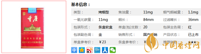 重慶紅香煙,煙長(zhǎng)84mm,過濾嘴長(zhǎng):36mm,焦油量11mg,采用濾嘴通風(fēng)技術(shù),有效降低了煙氣中有害物質(zhì)的含量,順應(yīng)了目前降焦減害的發(fā)展方向。味道醇淡順口,比較合口味,總得來說很不錯(cuò),煙燃燒很好,口感一般,偶爾抽抽還是可以。