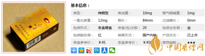 | 類型 :烤煙型 | 焦油量 :10mg | 煙氣煙堿量 :1mg | 一氧化碳量 :12mg |