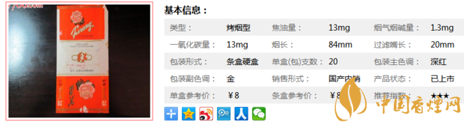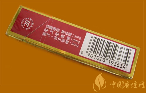 類(lèi)型 :烤煙型 焦油量 :13mg 煙氣煙堿量 :1.3mg 一氧化碳量 :13mg