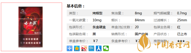 類型 :烤煙型 焦油量 :8mg 煙氣煙堿量 :0.7mg 一氧化碳量 :10mg