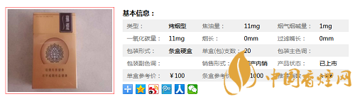 類型 :烤煙型 焦油量 :11mg 煙氣煙堿量 :1mg 一氧化碳量 :11mg
