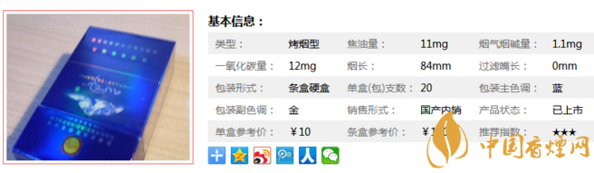 | 類型 :烤煙型 | 焦油量 :11mg | 煙氣煙堿量 :1.1mg | 一氧化碳量 :12mg |