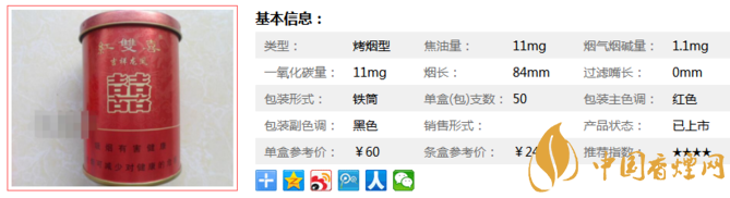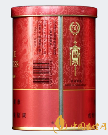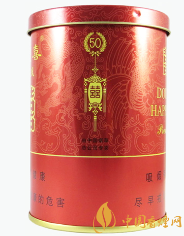 獨有的真空保存技術令卷煙的品質得到完美的體現。 其外包裝采用鐳射轉移技術,高貴的罐裝禮品盒,體面而討彩。此煙包裝圖案如同其名,紅底金字,有雙喜有龍鳳,開罐聞味,一股清香之氣撲鼻而來。送禮,結婚送禮,好意頭。