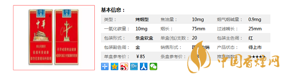 類型 :烤煙型 焦油量 :10mg 煙氣煙堿量 :0.9mg 一氧化碳量 :10mg