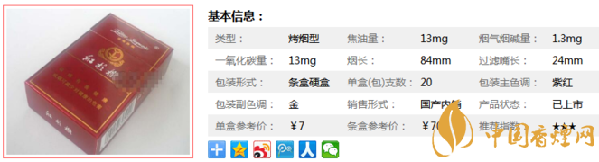 | 類型 :烤煙型 | 焦油量 :13mg | 煙氣煙堿量 :1.3mg | 一氧化碳量 :13mg |