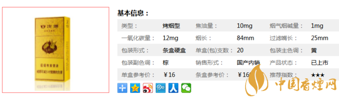 類型 :烤煙型 焦油量 :10mg 煙氣煙堿量 :1mg 一氧化碳量 :12mg