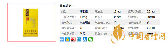 | 類型 :烤煙型 | 焦油量 :11mg | 煙氣煙堿量 :1.1mg | 一氧化碳量 :10mg |