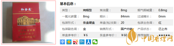 類(lèi)型 :烤煙型 焦油量 :8mg 煙氣煙堿量 :0.8mg 一氧化碳量 :8mg