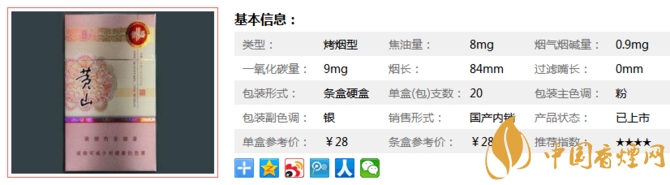 | 類型 :烤煙型 | 焦油量 :8mg | 煙氣煙堿量 :0.9mg | 一氧化碳量 :9mg |