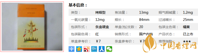 “江山”牌低危害卷煙通過科學的配方手段;利用先進的添加技術,添加了大量的名貴中草藥提取液,每支煙中含有0.5%的“仙芪補腎顆粒”新型料液,它是由精選的淫羊藿、白芍、仙茅、黃芪、柴胡等多味中草藥嚴格按照現代制藥技術精練濃縮而成下面我們一起來看江山精品的參數信息:焦油量:13mg. 煙堿量:1.2mg. 一氧化碳量:12mg.