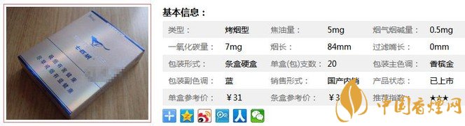 類型 :烤煙型 焦油量 :5mg 煙氣煙堿量 :0.5mg 一氧化碳量 :7mg