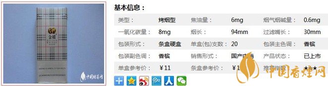 類型 :烤煙型 焦油量 :6mg 煙氣煙堿量 :0.6mg 一氧化碳量 :8mg
