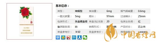 類型 :烤煙型 焦油量 :6mg 煙氣煙堿量 :0.6mg 一氧化碳量 :5mg