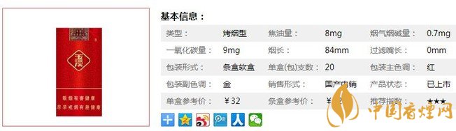 類型 :烤煙型 焦油量 :8mg 煙氣煙堿量 :0.7mg 一氧化碳量 :9mg