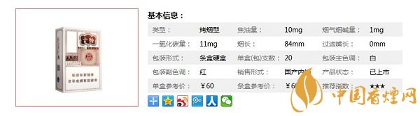 類型 :烤煙型 焦油量 :10mg 煙氣煙堿量 :1mg 一氧化碳量 :11mg