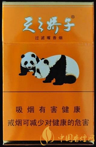 嬌子盛世天嬌香煙熊貓主圖案對比上一代的處理,更加寫實化,雙熊貓的出現,更加符合傳統中國好事成雙的寓意,相較上一代熊貓主圖案,新款天嬌在對熊貓的工藝處理上細節更顯精致。煙支外觀也非常的漂亮,濾嘴顏色呼應著包裝顏色,上面布滿祥云圖案,偏下的地方金色的漢字“天之嬌子”,對面是“天嬌印”。濾嘴最下方是一粗一細兩圈金色的線。