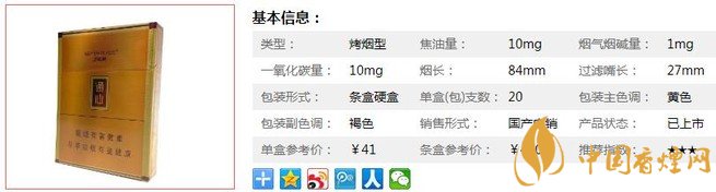 | 類型 :烤煙型 | 焦油量 :10mg | 煙氣煙堿量 :1mg | 一氧化碳量 :10mg |