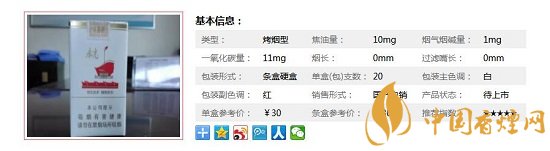 類型 :烤煙型 焦油量 :10mg 煙氣煙堿量 :1mg 一氧化碳量 :11mg