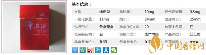 中南海祥和132價格表一覽 中南海系列難得的一款烤煙
