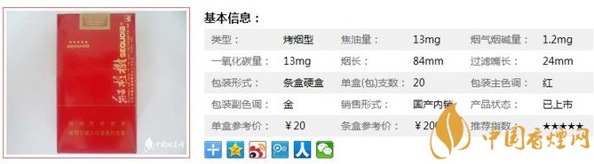 類型 :烤煙型 焦油量 :13mg 煙氣煙堿量 :1.2mg 一氧化碳量 :13mg