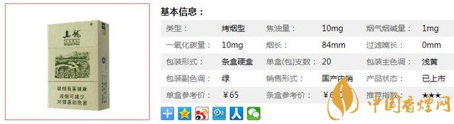 類型 :烤煙型 焦油量 :10mg 煙氣煙堿量 :1mg 一氧化碳量 :10mg