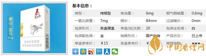 泰山6mg比中南海醇厚,比8MG的那款柔,不卡嗓子,生煙味也不濃,焦油量低,又短一口,對身體危害小,值得入手。經香煙網小編市場調查泰山6mg售價為15元/包。