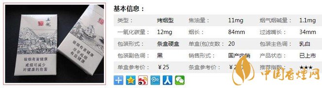 類型 :烤煙型 焦油量 :11mg 煙氣煙堿量 :1.1mg 一氧化碳量 :12mg