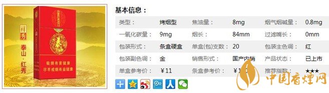 泰山祥秀是一款山東煙,本質中就有著樸素、實在。與其說這包煙的包裝普通不如說它更有喜慶,口味方面,質感都較好,較細,略淡,諧調性都達到平衡,煙氣較細膩,口感較適有甜感, 抽吸品還是比較好的。經香煙網小編市場調查泰山祥秀售價為11元/包。