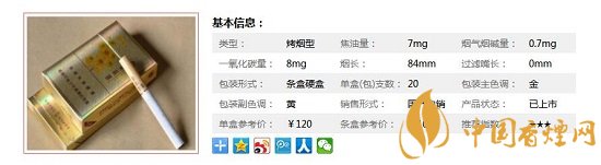 類型 :烤煙型 焦油量 :7mg 煙氣煙堿量 :0.7mg 一氧化碳量 :8mg