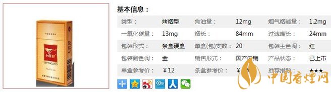| 類型 :烤煙型 | 焦油量 :12mg | 煙氣煙堿量 :1.2mg | 一氧化碳量 :13mg |