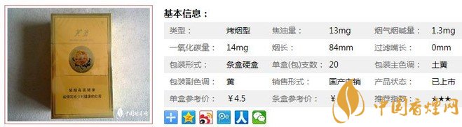 類型 :烤煙型 焦油量 :13mg 煙氣煙堿量 :1.3mg 一氧化碳量 :14mg