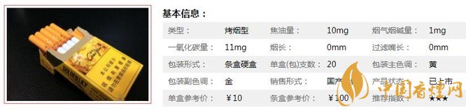 類(lèi)型 :烤煙型 焦油量 :10mg 煙氣煙堿量 :1mg 一氧化碳量 :11mg