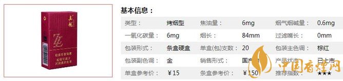 | 類型 :烤煙型 | 焦油量 :6mg | 煙氣煙堿量 :0.6mg | 一氧化碳量 :6mg |