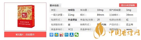 | 類型 :烤煙型 | 焦油量 :10mg | 煙氣煙堿量 :1mg | 一氧化碳量 :11mg |