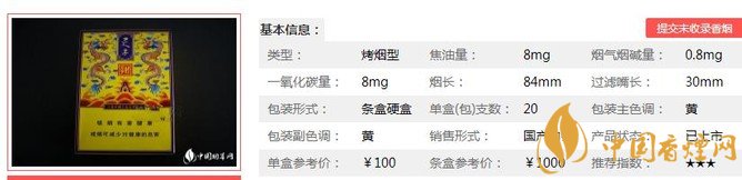 類型 :烤煙型 焦油量 :8mg 煙氣煙堿量 :0.8mg 一氧化碳量 :8mg