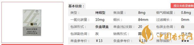 類型 :烤煙型 焦油量 :8mg 煙氣煙堿量 :0.8mg 一氧化碳量 :10mg