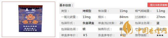| 類(lèi)型 :烤煙型 | 焦油量 :11mg | 煙氣煙堿量 :1.1mg | 一氧化碳量 :13mg |